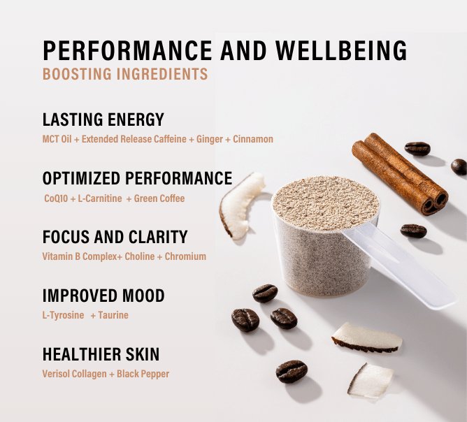 Unleash sustained energy with our formula—caffeine, MCT Oil, and COQ-10 for vitality. Elevate focus with B-complex, L-Tyrosine, and Choline. Optimize performance with MCT Oil, L-Carnitine, and Vitamin B. Support wellness with stress-regulating neurotransmitters and Verisol Collagen for reduced wrinkles and enhanced health. Experience clean, lasting energy, heightened focus, optimized performance, and daily well-being in one powerful blend.