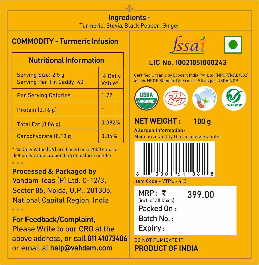 Turmeric Ginger Latte, Golden Milk Powder SuperFood, 100 Gm